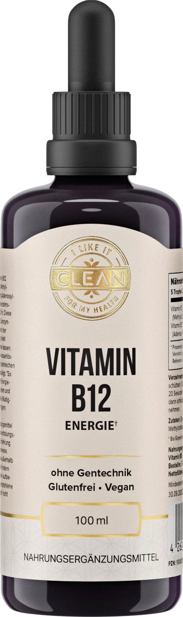 Le gocce di Vitamina B12 Liquida di i like it clean combinano metilcobalamina e adenosilcobalamina. Entrambe le forme di vitamina B12 sono attive e possono essere assorbite direttamente dal metabolismo dell'organismo senza essere convertite. Le gocce senza alcol sono prodotte interamente senza additivi non necessari e si basano esclusivamente su glicerina biologica, ottenuta da semi di lino e acqua purificata.