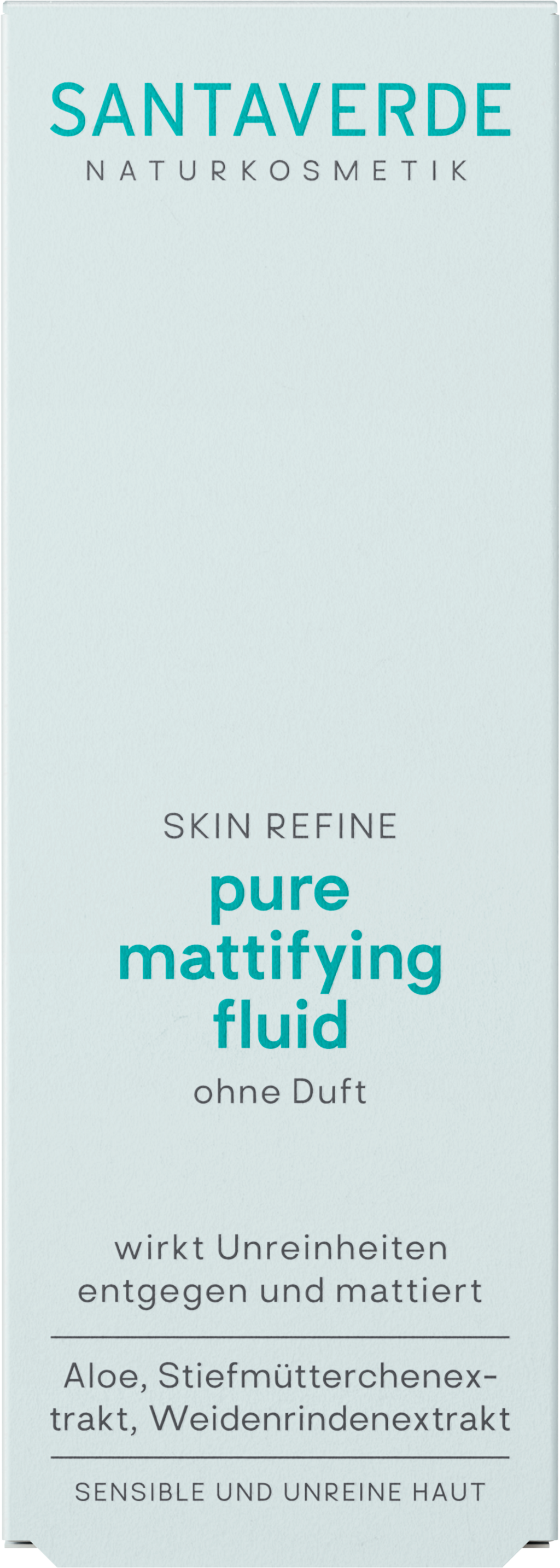 Affinché la pelle appaia pulita e opaca, le pelli impure, lucide e sensibili necessitano sempre della giusta cura del viso. Proprio per questo esiste il fluido SANTAVERDE arricchito con succo di aloe vera, oli lenitivi di enotera e rosa canina, estratto di viola e acido ialuronico. Quando si utilizza questo prodotto, la pelle viene liberata dalle impurità e riceve un'idratazione ideale. Allo stesso tempo, la barriera cutanea è protetta dagli influssi esterni. Grazie all'effetto protettivo e nutriente dei numerosi ingredienti contenuti, la pelle appare più pulita.